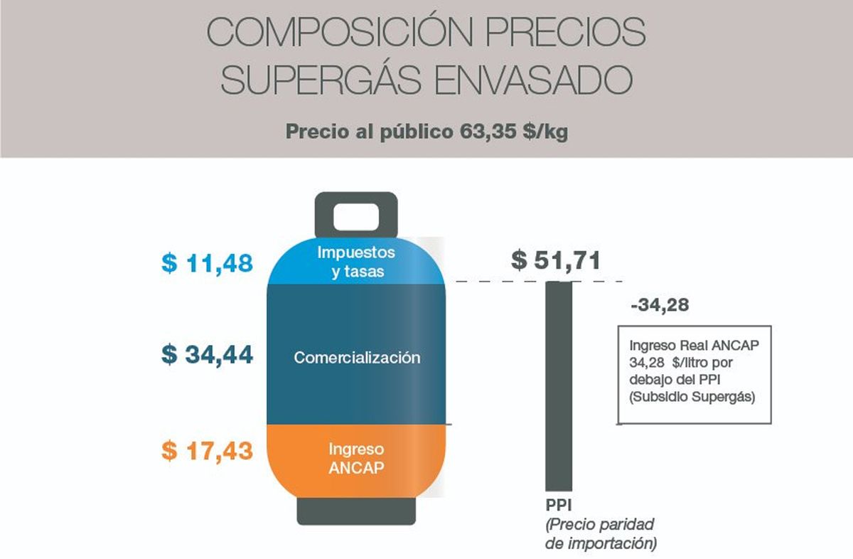 Para el caso del supergás, que está a 63,35 pesos el kilo; 11,48 pesos corresponden a tasas e impuestos; 34,44 al costo de comercialización; y 17,43 al ingreso de ANCAP.