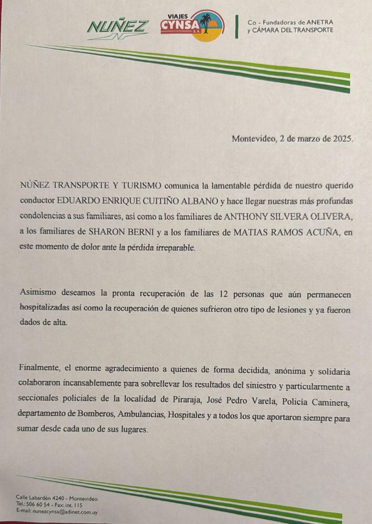 “Núñez Transporte y Turismo comunica la lamentable pérdida de nuestro querido conductor Eduardo Enrique Cuitiño Albano y hace llegar nuestras más profundas condolencias a sus familiares, así como a los familiares de Anthony Silvera Olivera, a los familiares de Sharon Berni y a los familiares de Matías Ramos Acuña, en este momento de dolor ante la pérdida irreparable”, dice el comunicado.