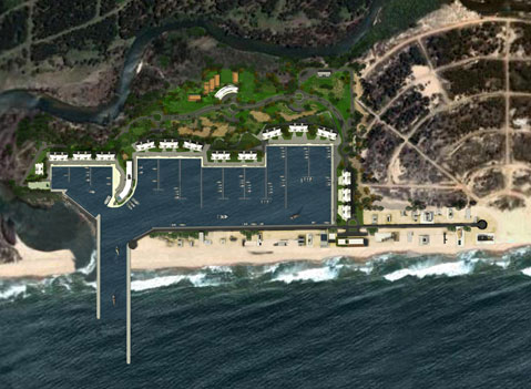 La zona, que actualmente es una franja de arena que separa un paisaje natural de arroyo arbolado de un lado, y mar del otro, se convertirá en un complejo náutico-inmobiliario producto de una millonaria inversión de capitales argentinos.