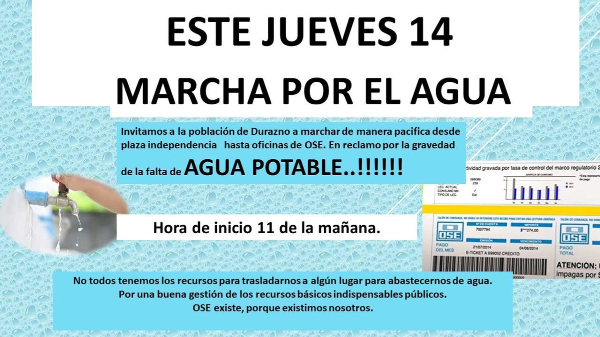 "Invitamos a la población de Durazno a marchar de manera pacífica desde plaza Independencia hasta oficinas de OSE en reclamo por la gravedad de la falta de agua potable", indica la convocatoria.