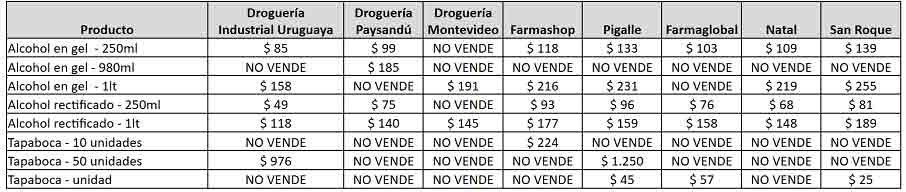 En cuanto al frasco más chico de alcohol en gel (250 cc), el más barato se puede conseguir en Droguería Industrial Uruguay a 85 pesos y los más caros en farmacias San Roque 139 pesos y Pigalle 133 pesos. El más barato de la lista está en Farmaglobal a 103 pesos.