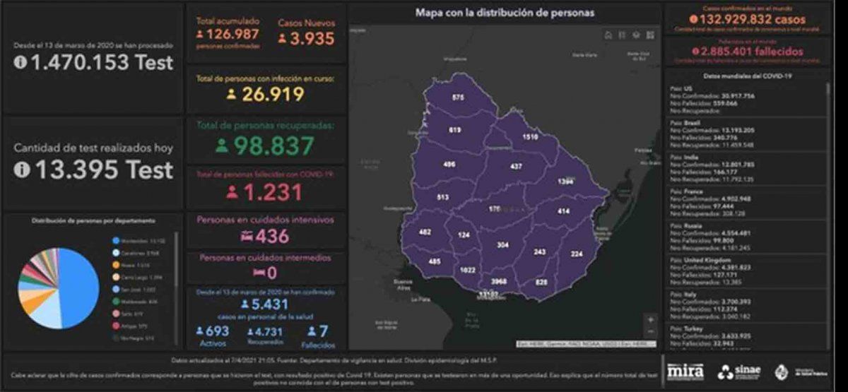 Según el último informe del SINAE, actualmente cursan la enfermedad 26.919 personas, de las cuales 436 están internadas en cuidados intensivos. Hasta el momento, los 19 departamentos presentan casos activos.
