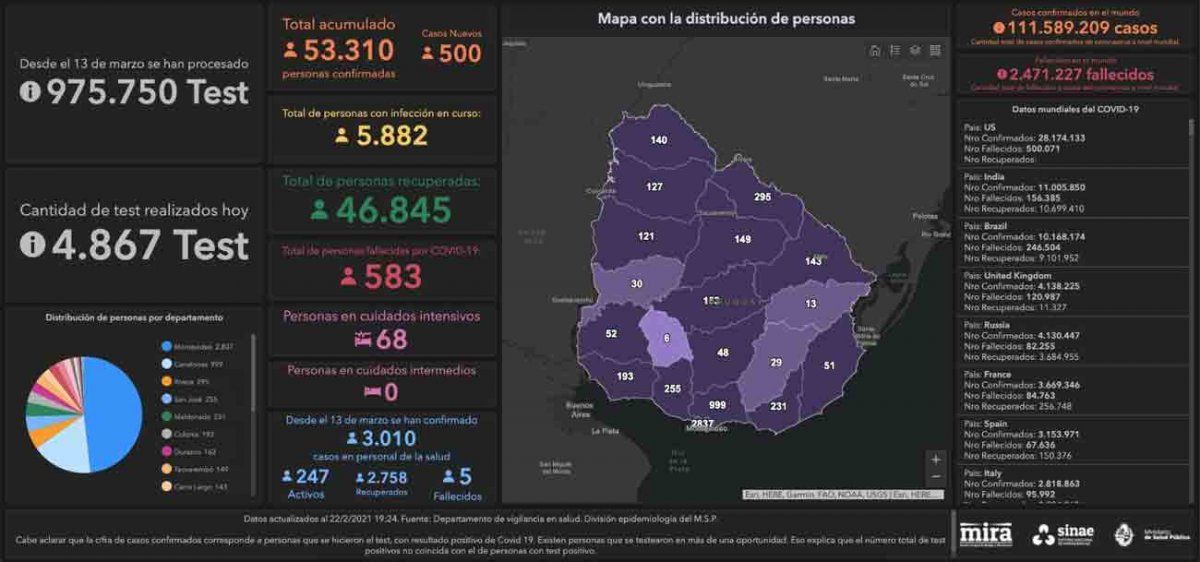 Uruguay registró este lunes 500 casos nuevos de Coronavirus Covid-19, en una base de 4.867 análisis procesados, lo que da una positividad del 10,27%.