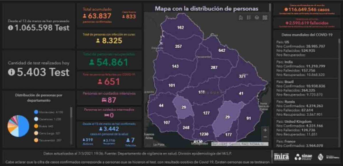 Según el último informe del SINAE, hay 8.325 personas cursando la enfermedad, de las cuales 87 se encuentran internadas en cuidados intensivos. Hasta el momento, los 19 departamentos presentan casos activos.