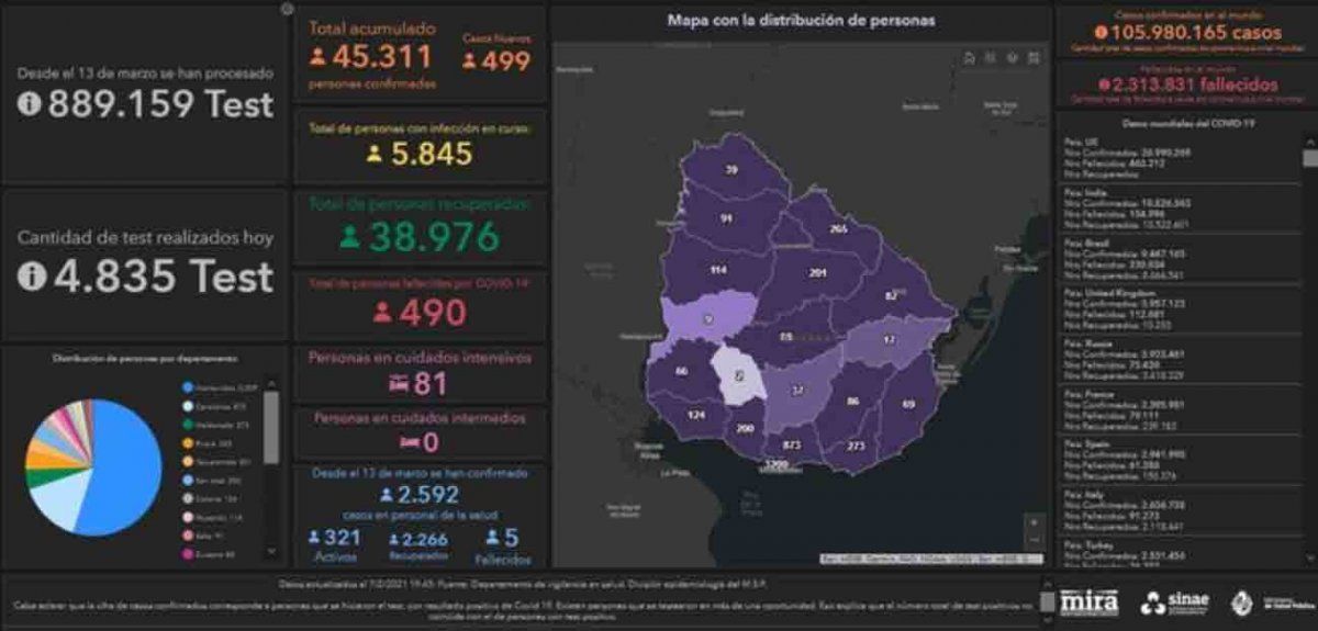 Uruguay registró este domingo 499 casos nuevos de Coronavirus Covid-19, en una base de 4.835 análisis procesados, lo que da un porcentaje de positividad del 10,32%.