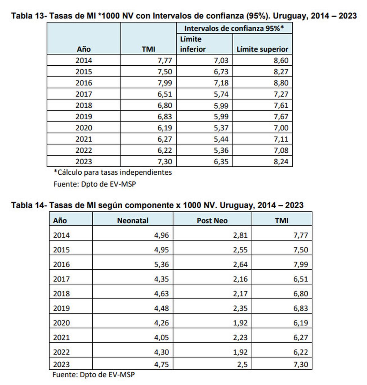 De acuerdo al informe preliminar del 2023 presentado por el MSP, la tasa de mortalidad infantil (cada 1.000 nacidos vivos) fue de 7,30 el año pasado, con un "intervalo de confianza de 95%" que va desde 6,35 en el límite inferior a 8,24 en el límite superior.