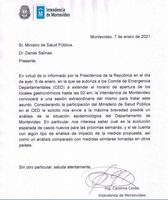 La carta que la Intendenta Carolina Cosse le envió al Ministro de Salud Pública, Daniel Salinas, sostiene que en virtud de lo informado por la Presidencia de la República en el día 6 de enero, en la que se autoriza a los Comité de Emergencia Departamental a extender el horario de apertura de los locales gastronómicos hasta las 02 de la mañana, la Intendencia de Montevideo convocará a una sesión extraordinaria del mismo para tratar este asunto.