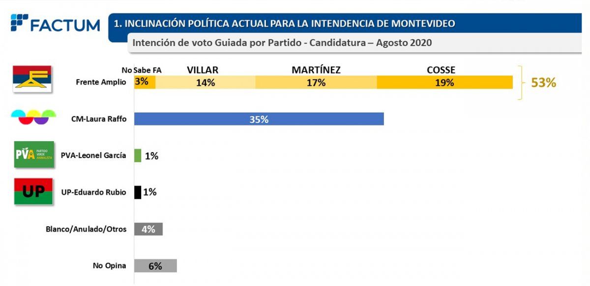 Cosse lidera con 19%, dentro de un Frente Amplio que tiene 53%; Raffo suma 35%
