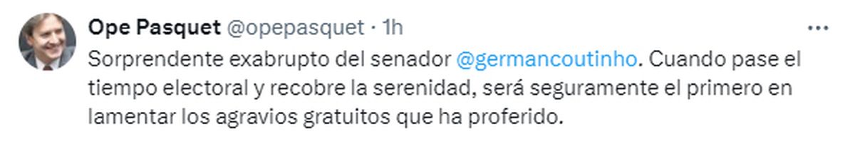 El diputado Ope Pasquet le respondió a Coutinho. "Sorprendente exabrupto del senador Germán Coutinho. Cuando pase el tiempo electoral y recobre la serenidad, será seguramente el primero en lamentar los agravios gratuitos que ha proferido", escribió en X.