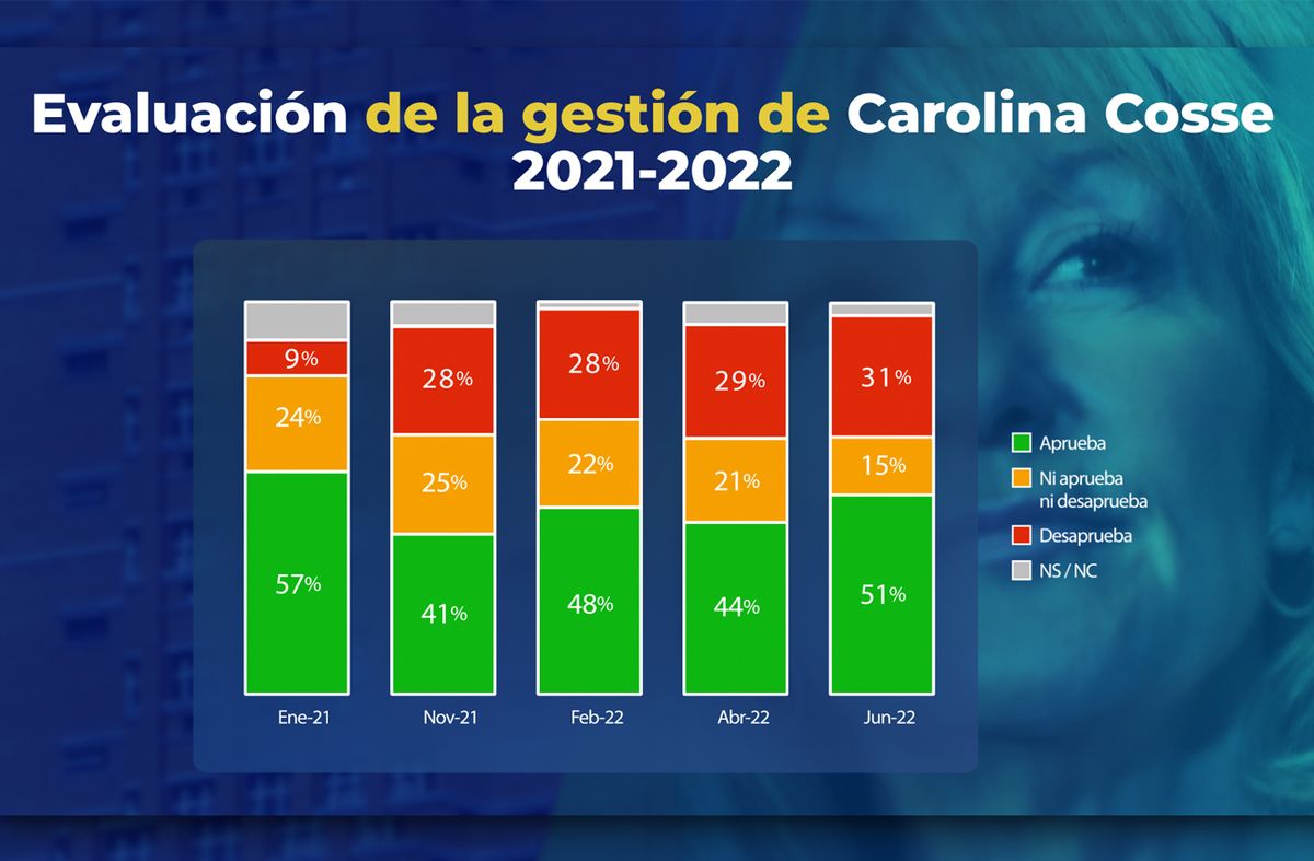 Esta es la quinta medición que Equipos Consultores realiza sobre el desempeño de la Intendenta, según la evaluación de los ciudadanos de la capital. En la primera de ellas, a poco más de un mes de asumir (enero de 2021) Cosse se encontraba en plena “luna de miel” con la ciudadanía y recibía en ese momento una aprobación de 57% y una desaprobación de 9%.