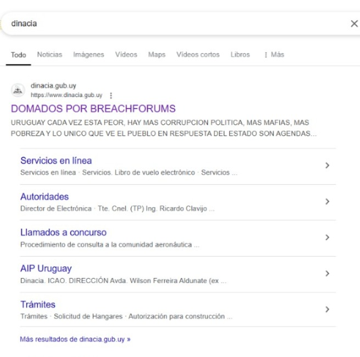 El comandante de la Fuerza Aérea, Fernando Colina, informó que el Ministerio de Defensa ordenó bajar el sitio web de la Dirección Nacional de Aviación Civil e Infraestructura Aeronáutica (Dinacia), tras el hackeo. Al menos hasta que se encuentre una solución y se pueda obtener detalles del nivel del hackeo, dijo.