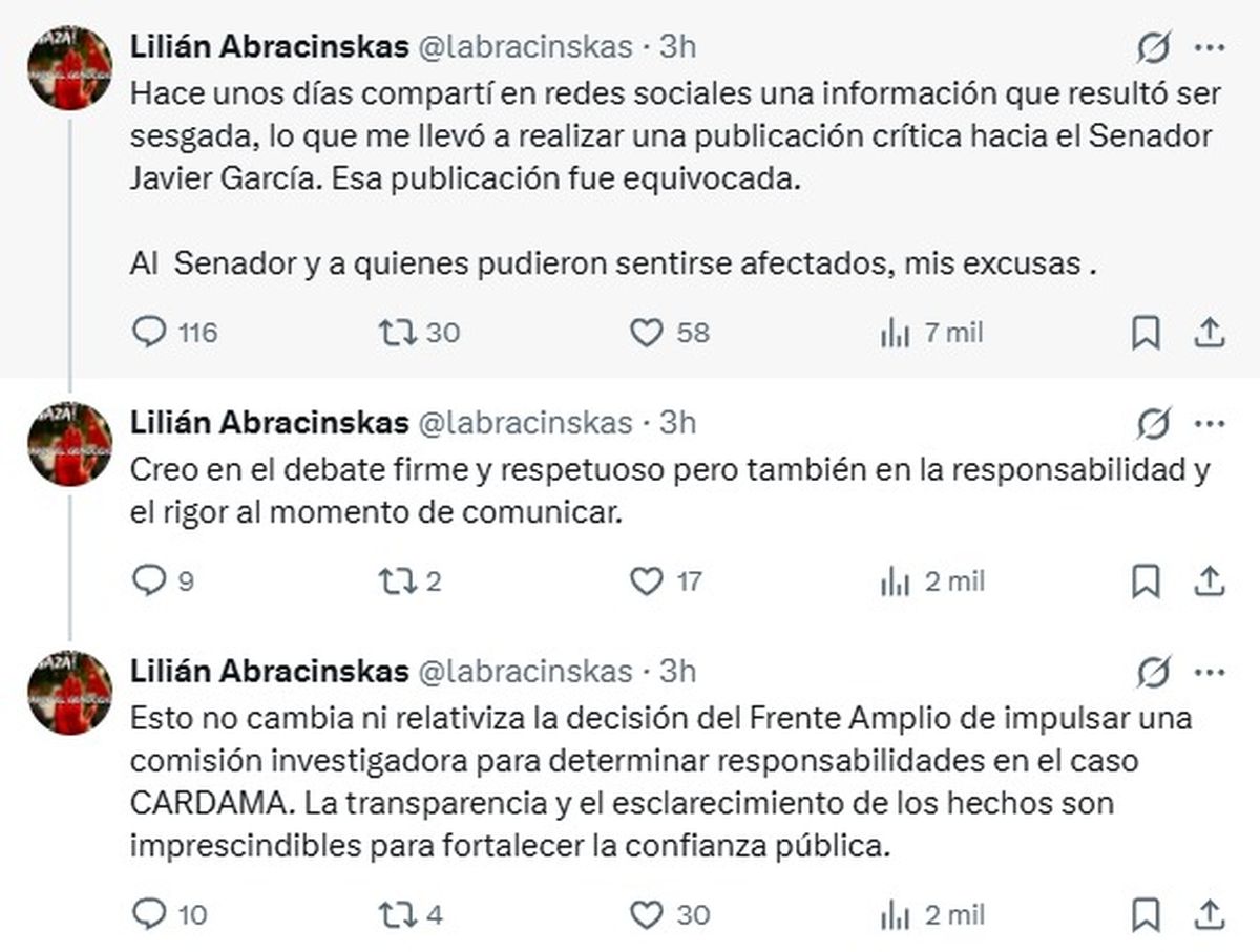 "Creo en el debate firme y respetuoso pero también en la responsabilidad y el rigor al momento de comunicar", afirmó. "Esto no cambia ni relativiza la decisión del Frente Amplio de impulsar una comisión investigadora para determinar responsabilidades en el caso Cardama. La transparencia y el esclarecimiento de los hechos son imprescindibles para fortalecer la confianza pública", agregó.