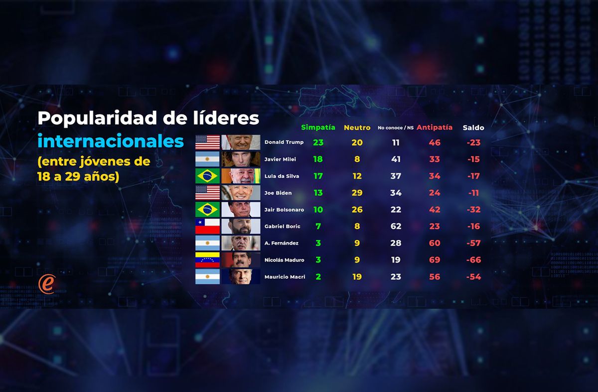 Si se miran solo las simpatías, es resaltable el nivel que recibe el ex presidente norteamericano Donald Trump (23%), y con un rechazo alto pero más moderado que en el total de la población. De hecho el saldo neto de Trump, que en el total de la población es de -48, entre los jóvenes es de -23.
