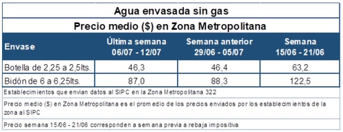 Las botellas costaban 63,2 pesos, en promedio, antes de que se quitaran los impuestos. Los bidones, 122,5 pesos. En la semana anterior, entre el 29 de junio y el 5 de julio, el precio fue de 46,4 pesos para botellas y 88,3 pesos para bidones. En esta, 46,3 pesos y 87 pesos respectivamente. Se trata siempre de un precio promedio de los enviados por los establecimientos.