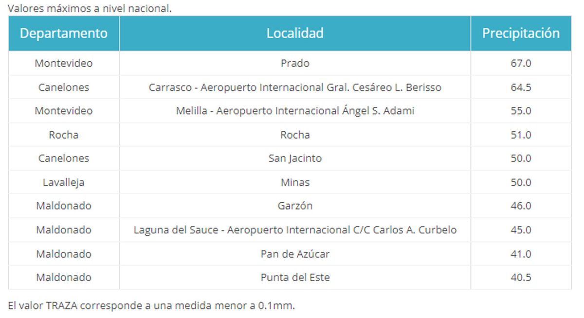 En Rocha, ciudad, el acumulado de lluvias tuvo un pico de 51 mm, y 50 mm en San Jacinto, Canelones, el mismo valor que en Minas, Lavalleja. En Maldonado, en tanto, los registros máximos están entre 40 y 46 mm.