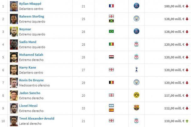 Esta lista es hoy lidera por el francés del PSG, Kylian Mbappé, con un valor de 180 millones.