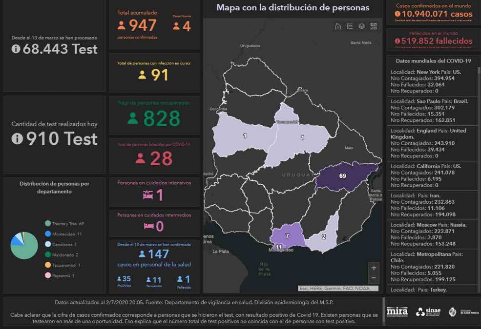 Asimismo, hasta el momento hay 91 personas cursando al enfermedad y solo una se encuentra internada en cuidados intensivos informó el SINAE.