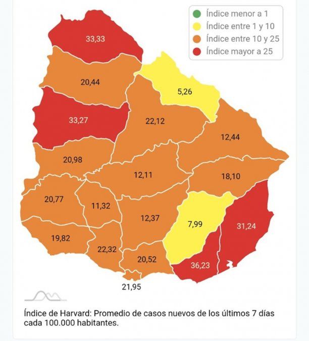 Artigas, Paysandú, Rocha y Maldonado son los departamentos que, hasta el momento, continúan en zona roja; mientras que el resto está en zona naranja.