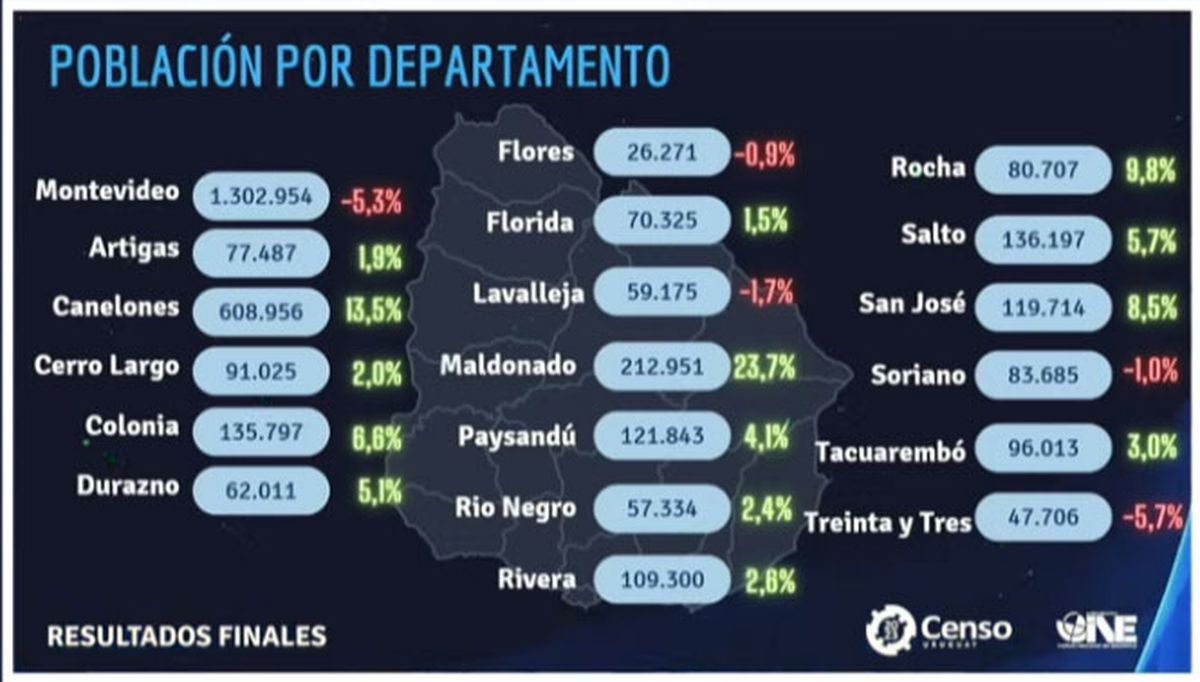 El departamento que más creció fue Maldonado, que tiene 212.951 habitantes, 23,7% más. Le sigue en crecimiento Canelones, que con 608.956 creció en población 13,5%.