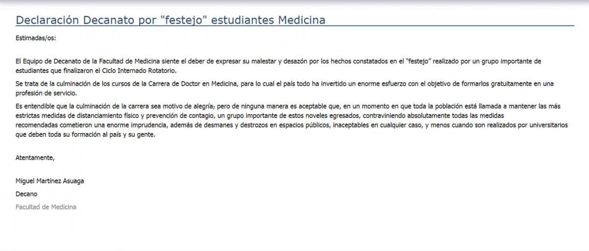 Martínez expresó "malestar y desazón" por la decisión que tomaron los estudiantes que finalizaron el Ciclo Internado Rotatorio. El decano aseguró es "entendible" que la culminación de la Carrera de Doctor en Medicina sea "motivo de alegría" pero no es "aceptable, que en un momento en que toda la toda la población está llamada a mantener las más estrictas medidas de distanciamiento físico y prevención de contagio, un grupo importante de estos noveles egresados, contraviniendo absolutamente todas las medidas recomendadas cometieron una enorme imprudencia, además de desmanes y destrozos en espacios públicos" escribió en una nota publicada en la página de la Facultad de Medicina.