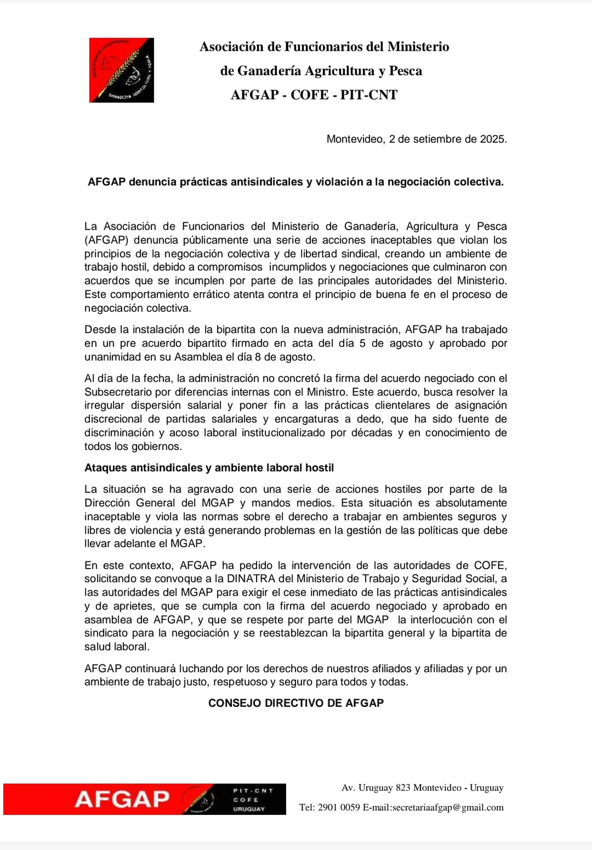 La Asociación de Funcionarios del Ministerio de Ganadería Agricultura y Pesca (AFGAP) denunció en un comunicado “prácticas antisindicales y violación a la negociación colectiva”. Piden que intervenga la Condeferación de Organizaciones de Funcionarios del Estado (COFE) y de la Dirección Nacional del Trabajo (Dinatra).