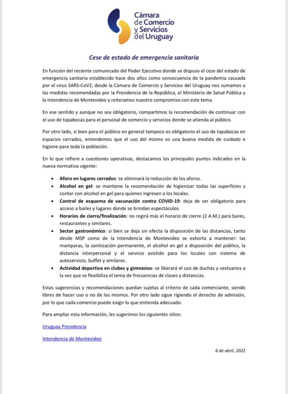 La Cámara de Comercio y Servicios emitió este miércoles recomendaciones a sus socios tras el levantamiento de la emergencia sanitaria, dispuesto por el Poder Ejecutivo.