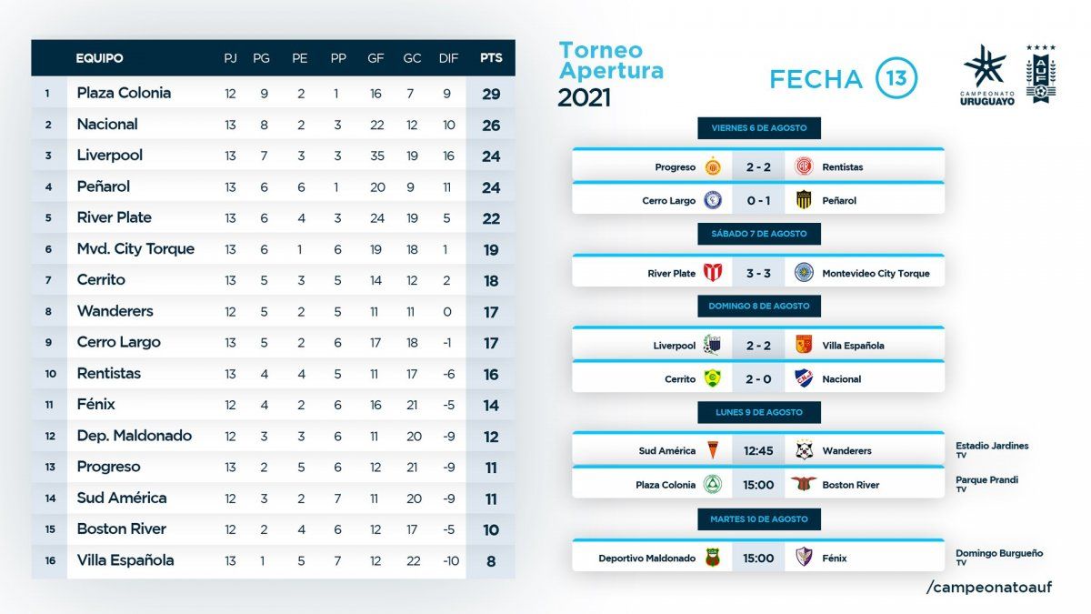 La fecha 13 del Torneo Apertura 2021 comenzó el viernes con el empate 2-2 de Progreso contra Rentistas, en el Parque Paladino. Luego Peñarol superó 1-0 a Cerro Largo, en el Ubiila de Melo y River Plate empató 3-3 contra Montevideo City Torque, en el Parque Saroldi.