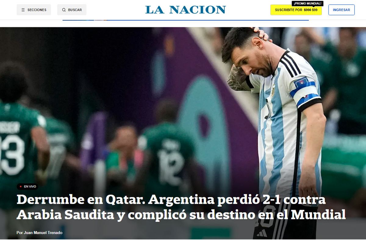 “Derrumbe en Qatar: Argentina perdió 2-1 contra Arabia Saudita y complicó su destino en el Mundial”, tituló el diario La Nación en su versión web.