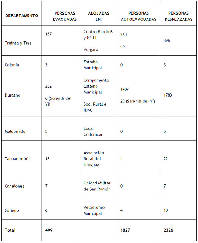 De acuerdo al último relevamiento del Sistema Nacional de Emergencia, asciende a 2.326 el número de personas desplazadas en todo el país por las inundaciones. 1.783 pertenecen al departamento de Durazno, 496 a Treinta y Tres, 22 a Tacuarembó, 10 a Soriano, 7 en Canelones, 5 a Maldonado y 3 a Colonia.