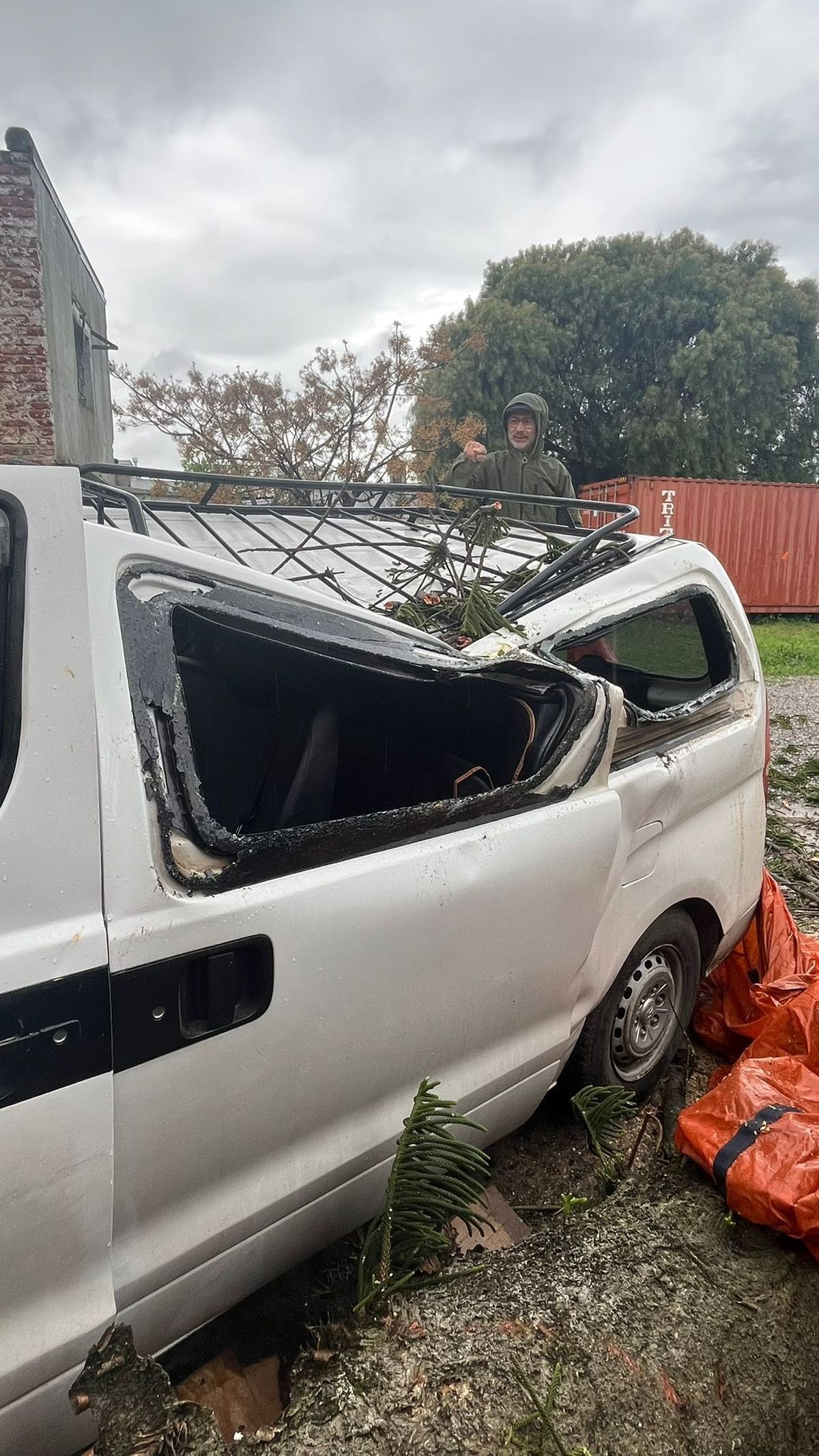 En La Paz, debido a los fuertes vientos de la madrugada del sábado, un pino cayó sobre una camioneta y sobre parte de una vivienda.