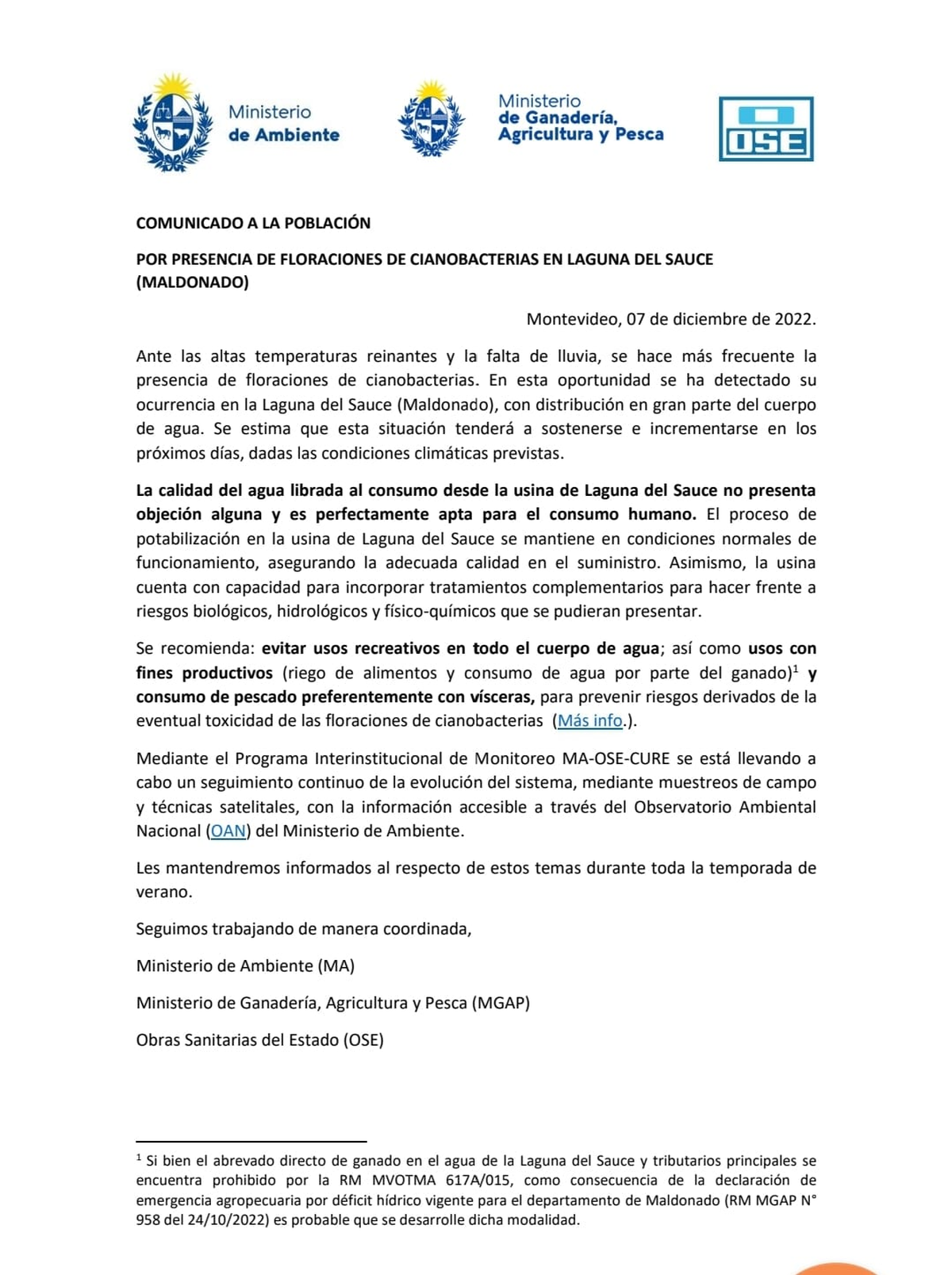 Al respecto del origen de las cianobacterias, explican que el clima con altas temperaturas y falta de lluvia contribuye a la presencia de esta floración. "Se estima que esta situación tenderá a sostenerse e incrementarse en los próximos días", agrega el comunicado e indica que se continúa con el monitoreo.