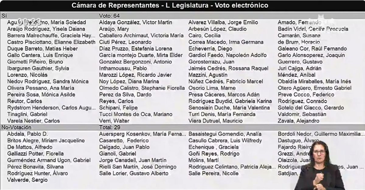 Fue aprobado con los votos del Frente Amplio, y varios legisladores del Partido Nacional y el Partido Colorado, que votaron divididos. También lo hizo el diputado del Partido Independiente.