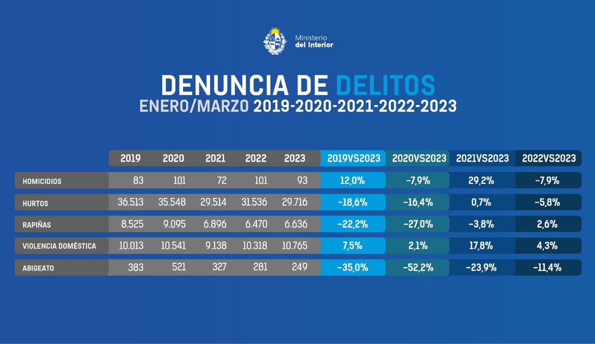 Las últimas cifras de delitos que publicó el Ministerio del Interior son del primer trimestre de 2023, en comparación con el mismo período de los años anteriores hasta 2019.