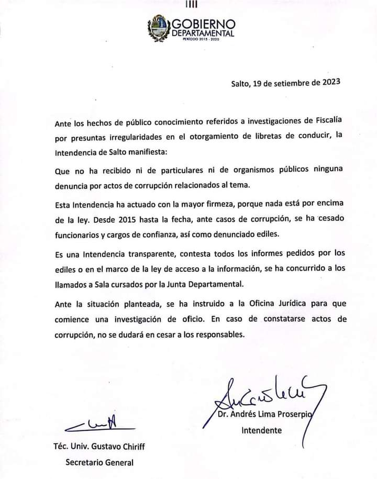 El intendente de Salto, Andrés Lima, divulgó una carta en la que informa que se inició una investigación de oficio y que no dudará en cesar funcionarios. Lima afirma que la comuna "no ha recibido ni de particulares ni de organismos públicos ninguna denuncia por actos de corrupción relacionados al tema".