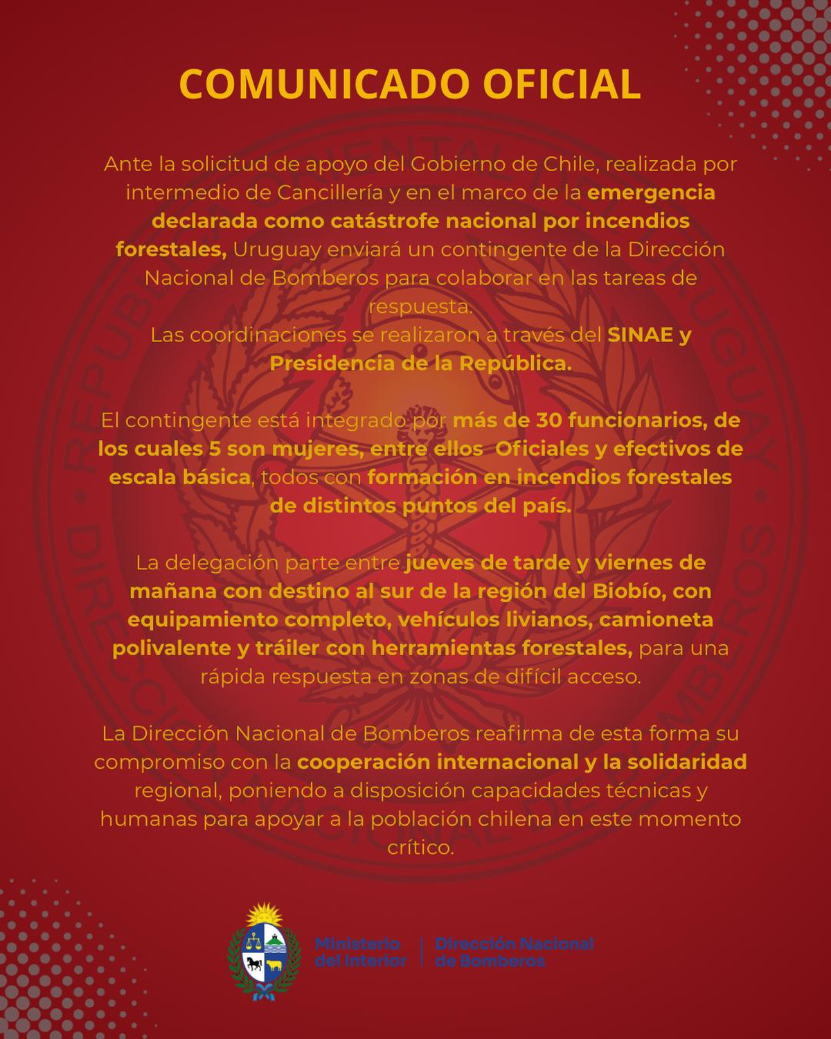 "Nosotros sabemos que vamos a la región de Ñuble, la topografía ahí es muy diferente a la que manejamos en nuestros incendios forestales acá en Uruguay. El personal ya entre mañana y el jueves tenemos reuniones de interacción y de planificación, y vamos a apoyar a Chile, por lo tanto vamos en un trabajo en conjunto con ellos y a disposición de ellos", explicó la directora de Bomberos.