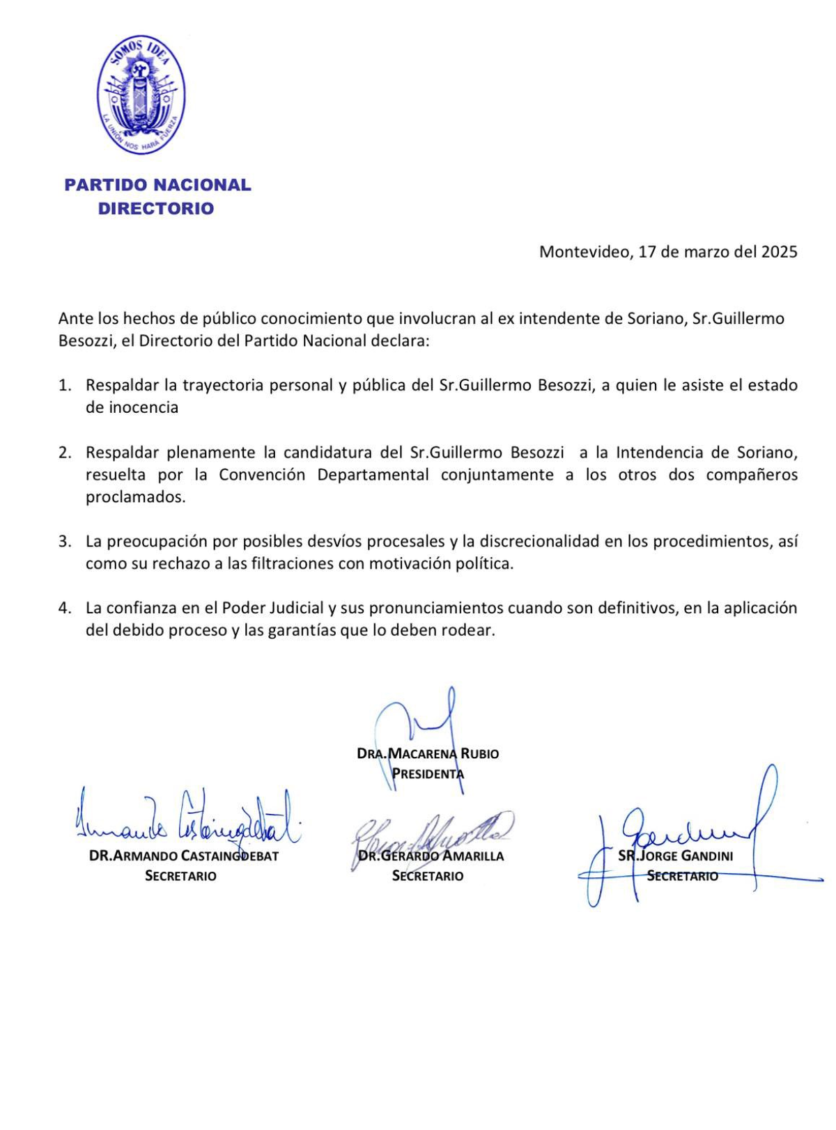 El Directorio del Partido Nacional aprobó por unanimidad una declaración de respaldo “a la trayectoria personal y pública” de Besozzi, y expresa “preocupación por posibles desvíos procesales” en su caso.