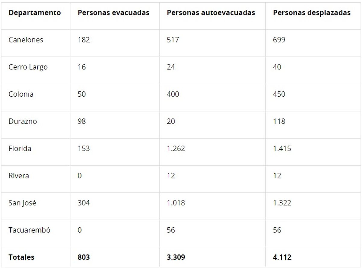 Florida es el departamento más afectado con 1.415 desplazados, en San José hay 1.322 personas fuera de sus hogares, 699 en Canelones, 450 en Colonia, 118 en Durazno, 56 en Tacuarembó, 40 en Cerro Largo y 12 en Rivera.