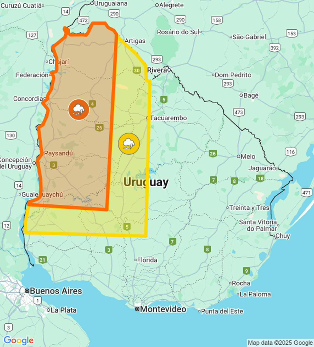 El Instituto Uruguayo de Meteorología (Inumet) emitió doble advertencia meteorológica en la mañana de este viernes por la ocurrencia de tormentas fuertes y lluvias abundantes. Incluye niveles de alerta naranja y amarilla y son para el litoral. Se actualizará a la hora 11:00.