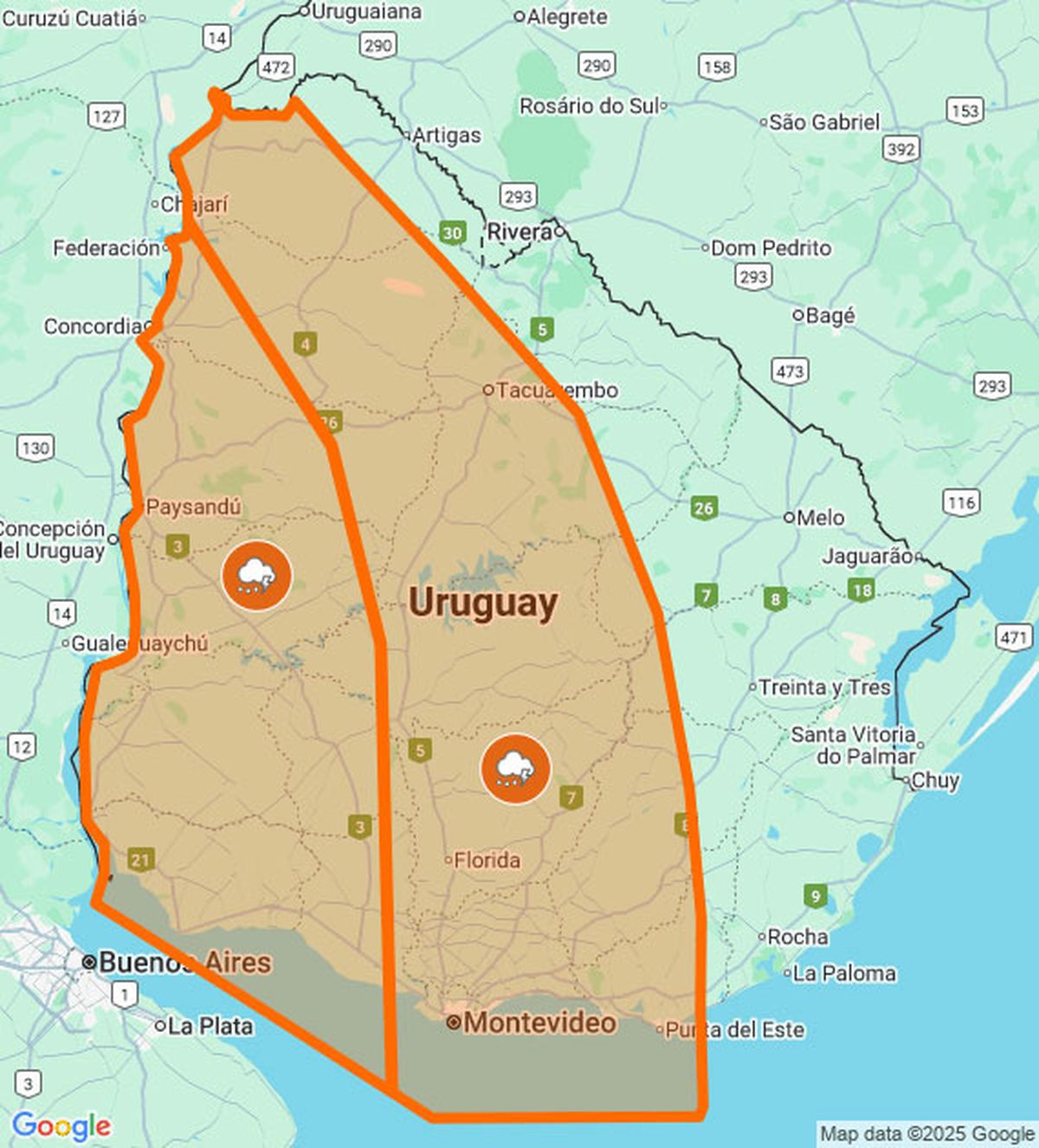 La segunda advertencia naranja comienza a las 3 AM y se actualizará a las 6 AM. En este caso la zona afectada es el centro del país, desde Artigas, Rivera y Tacuarembó hasta Montevideo, Canelones y Maldonado.