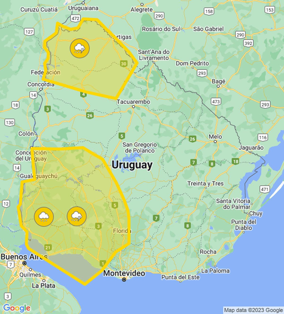 Meteorología publicó este miércoles de mañana, a la hora 8:15, una doble alerta amarilla. En el suroeste y centro del país la alerta es por tormentas fuertes y lluvias intensas. En tanto, la alerta amarilla en el norte es solo por tormentas fuertes, (ver mapa abajo).