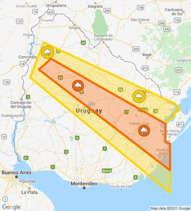 Abarca una franja diagonal que va desde Salto y Paysandú hasta Rocha. Mucha lluvia en poco tiempo, ocasional granizo e intensa actividad eléctica.