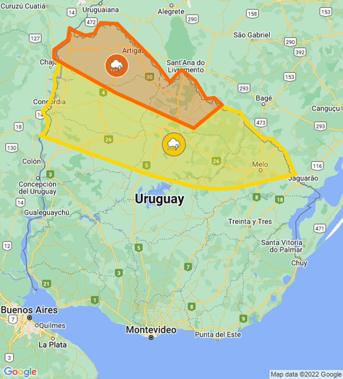 La alerta naranja de Meteorología es para la zona norte: Artigas, parte de Salto, y Rivera. La alerta amarilla va desde Salto y Paysandú hasta Cerro Largo.
