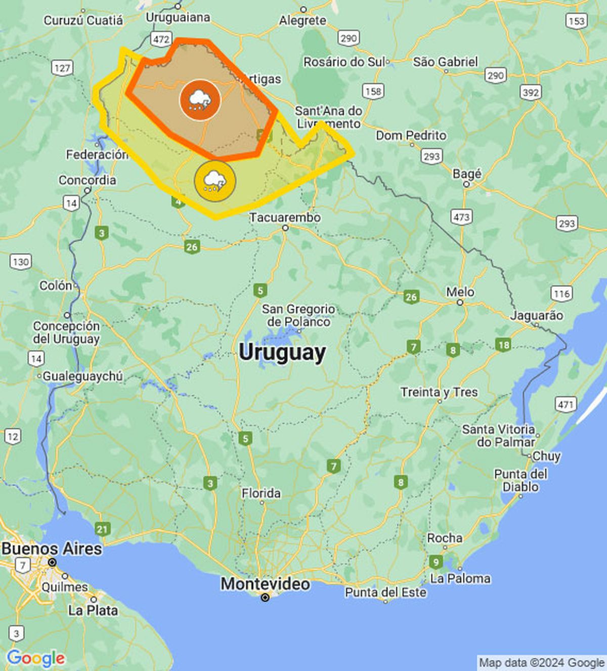 Meteorología actualizó la advertencia por mal tiempo y publicó esta tarde una doble alerta naranja y amarilla por tormentas fuertes y lluvias intensas para el extremo norte del país: Artigas y parte de Salto y Rivera.