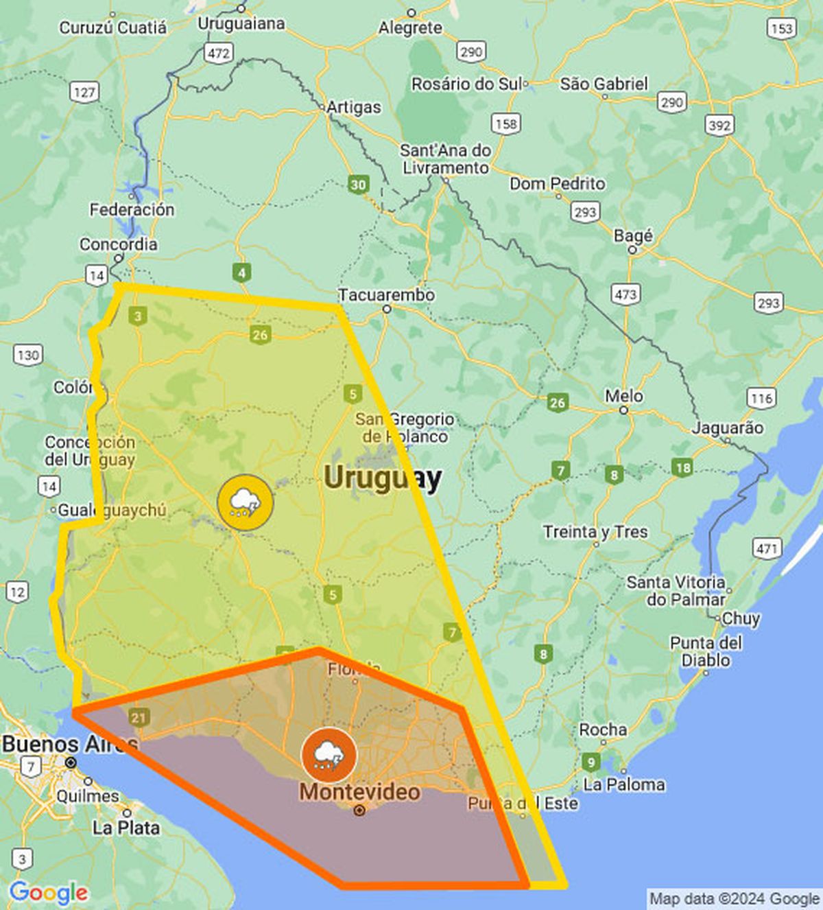 Meteorología publicó a la hora 13 una alerta naranja y otra amarilla por tormentas fuertes y lluvias intensas para el litoral, centro y sur del país: ver mapa.