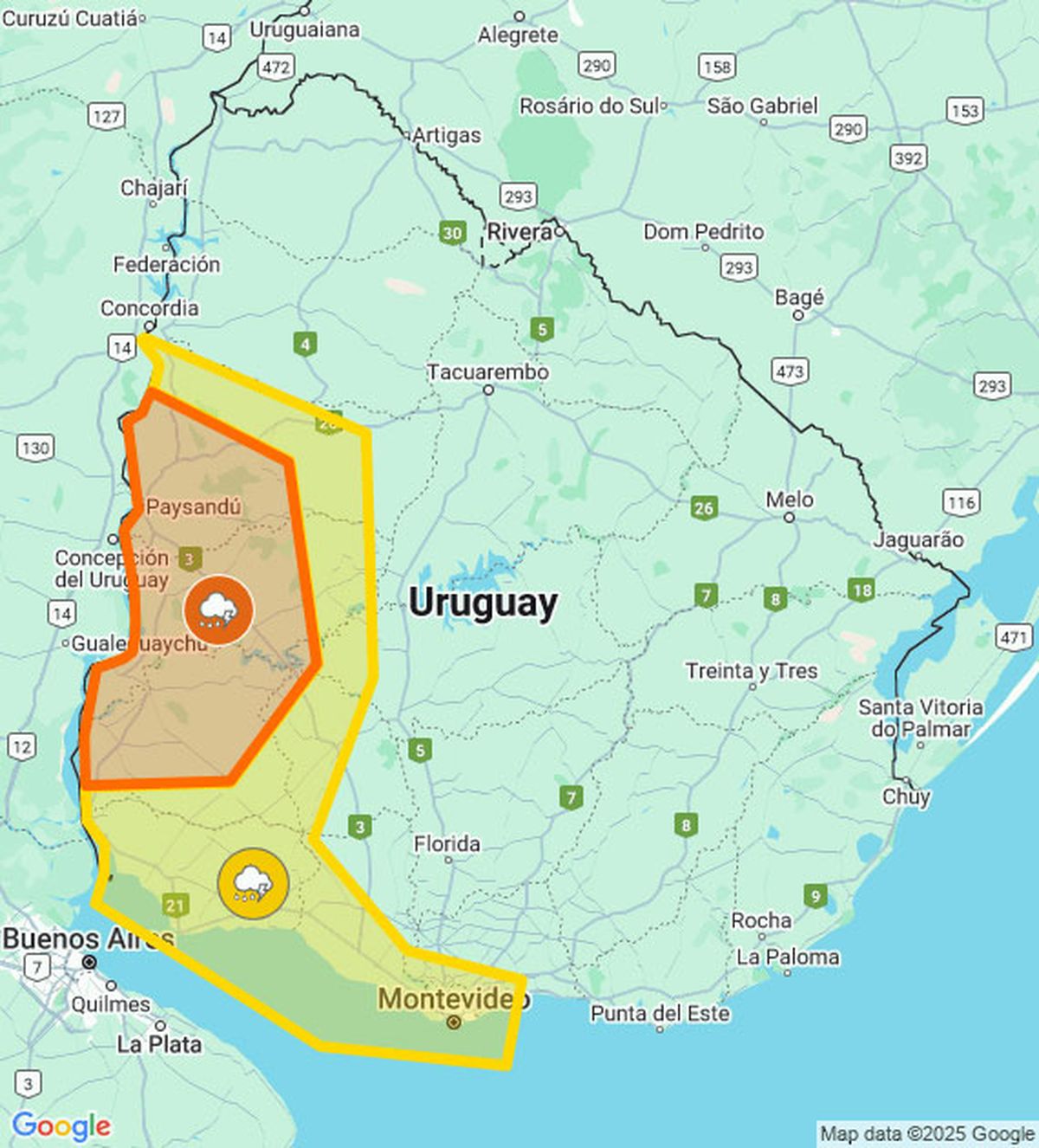 Meteorología amplió el nivel de riesgo a media mañana y a la alerta amarilla por tormentas fuertes y lluvias intensas le agregó una alerta naranja para una zona del litoral oeste.