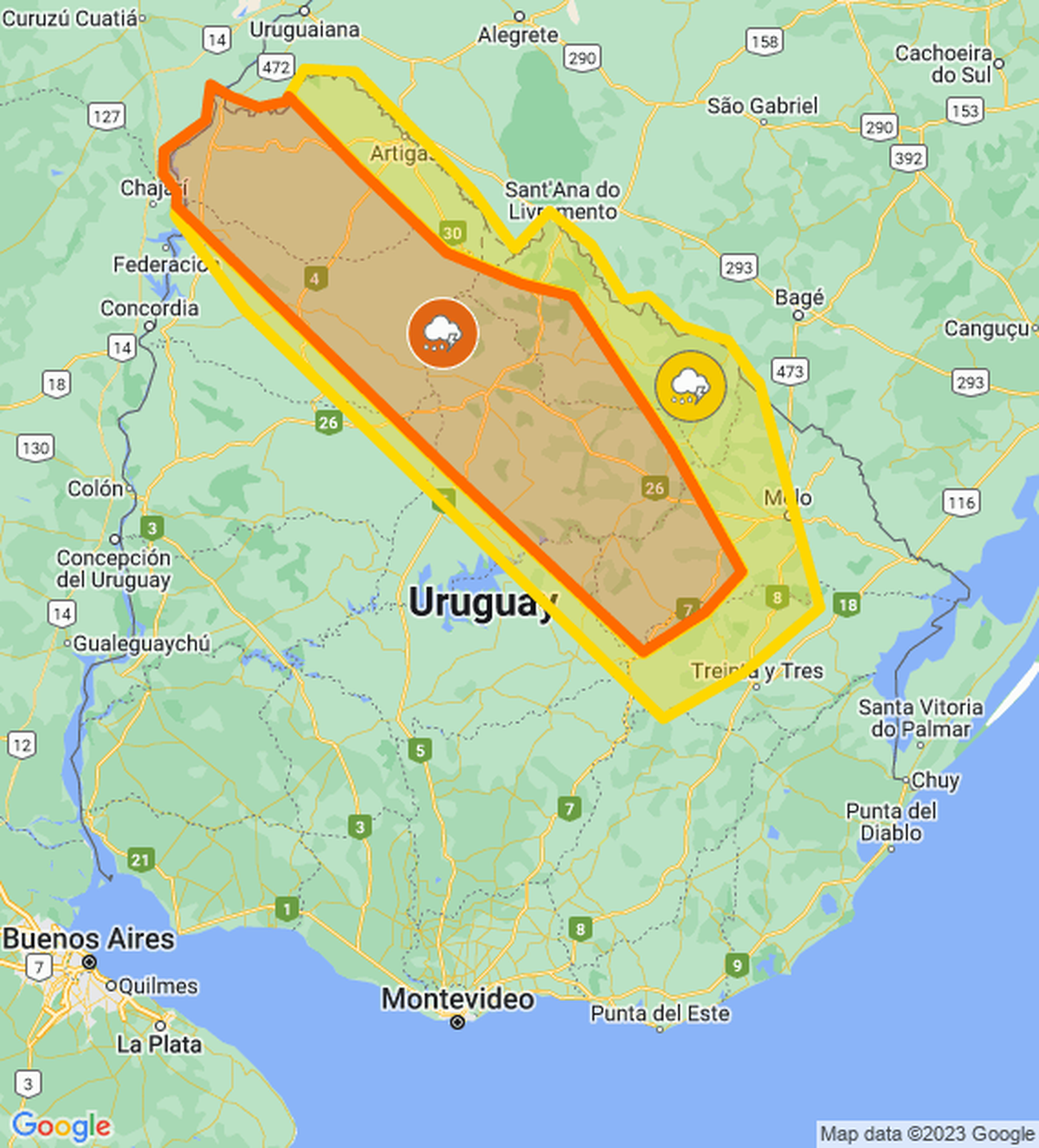 Meteorología emitió doble alerta, naranja y amarilla, por tormentas fuertes para parte del país. En estas localidades se podrán registrar lluvias intensas en períodos cortos, granizo, actividad eléctrica y rachas de viento muy fuertes.