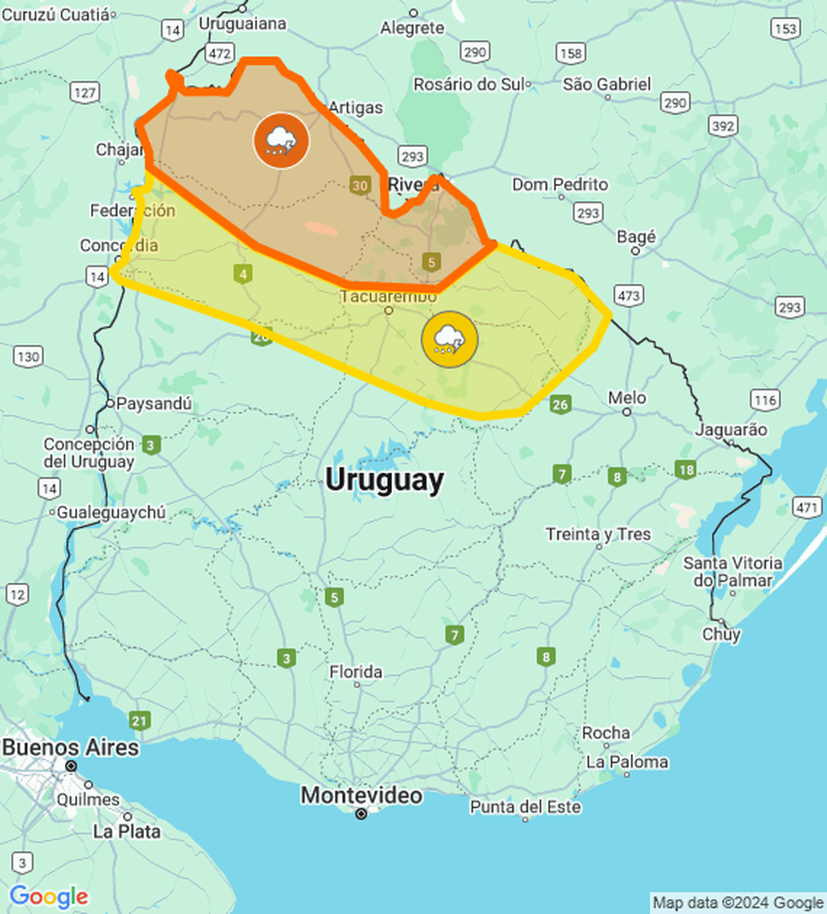 "Cabe destacar que en zonas de tormentas se podrán registrar intensa actividad eléctrica acompañadas de lluvias abundantes en cortos períodos, ocasional caída de granizo y rachas de vientos fuertes. Se esperan mejoras temporarias durante la validez de la alerta. Se continuará monitoreando la situación y se informará ante eventuales cambios", expresó Inumet.