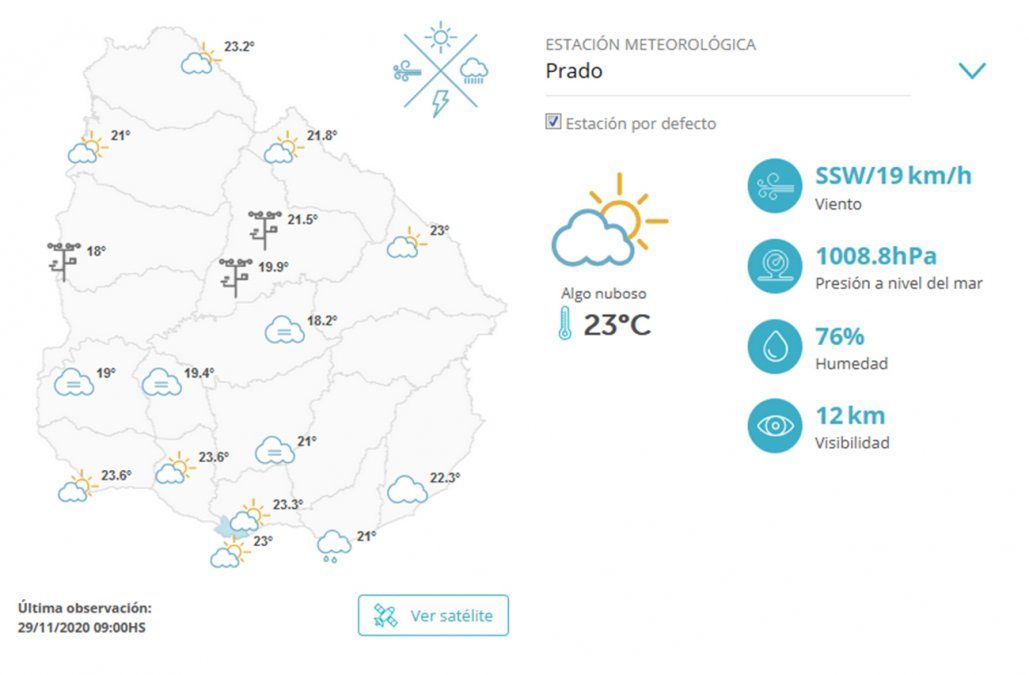 En el norte está nuboso con viento del SW/6 km/h, la humedad 78% y la visibilidad 20km. Hacia la tarde estará cubierto a nuboso con nieblas y neblinas, y hacia la noche nuboso con períodos de cubierto, con problables precipitaciones y tormentas.