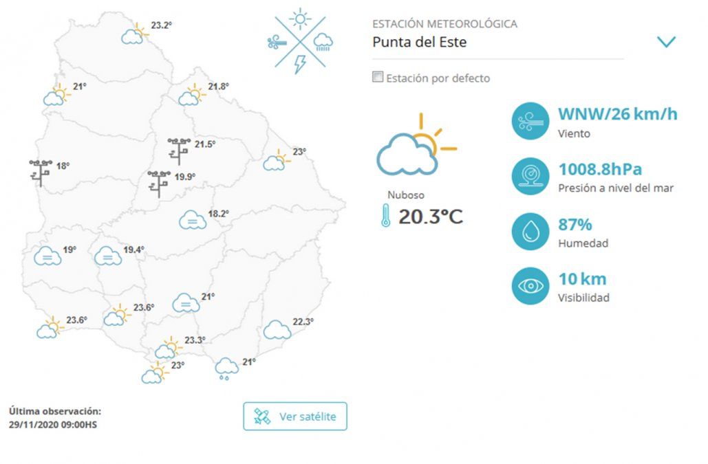 En el este está nuboso, con viento del WNW/26 km/h, la humedad 87% y la visibilidad 10km. Hacia la tarde estará cubierto a nuboso con nieblas y neblinas, con aumento de nubosidad, neblinas y bancos de niebla hacia la noche. La temperatura mínima 17º y la máxima 21º.