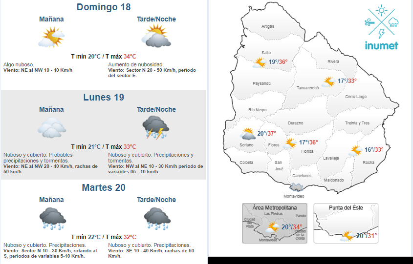 Este domingo se presentará caluroso y húmedo en Montevideo y la Zona Metropolitana, con una temperatura mínima estimada de 20º y máxima de 34º, según el INUMET.